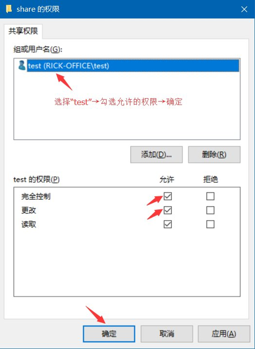 5.輸入新建的用戶名“test”→檢查名稱→確定;