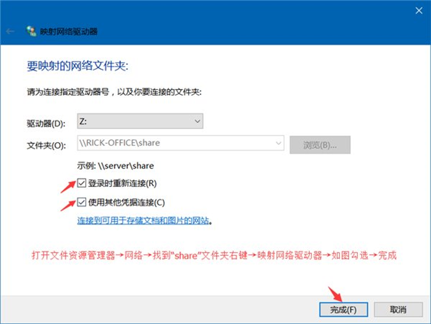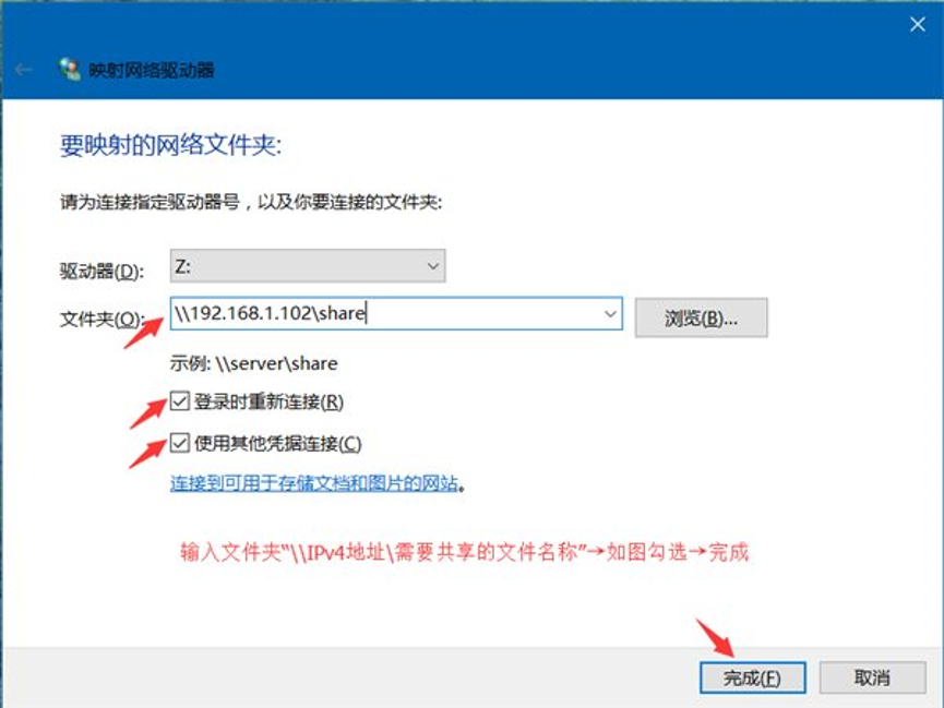 14.輸入文件夾\\\\IPv4地址\\需要共享的文件夾名稱→如圖勾選→完成;