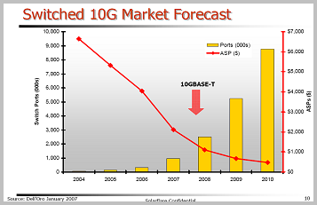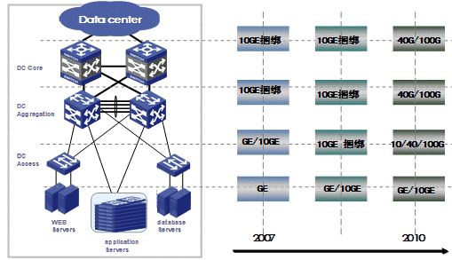 從服務(wù)器數(shù)量上看,數(shù)據(jù)中心呈現(xiàn)一個明顯的發(fā)展規(guī)律———萬臺服務(wù)器規(guī)模的數(shù)據(jù)中心將是發(fā)展主流。同時,隨著單臺服務(wù)器集成的計算核數(shù)量的增長,其消耗的帶寬也同步增長,而10GE網(wǎng)卡采的硬件加速技術(shù)(TCP offload, iSCSI offload, RDMA acceleration)使服務(wù)器的吞吐能力接近線速。Gartner及Dell’Oro預(yù)測2006-2010年10GE交換端口的年增長率超過100%。