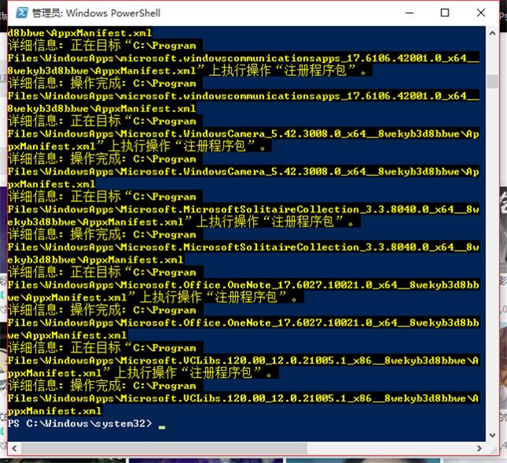 4、輸入命令:Get-AppxPackage | % { Add-AppxPackage -DisableDevelopmentMode -Register "$($_.InstallLocation)AppxManifest.xml" -verbose } 回車;
