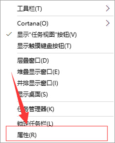 1、在系統(tǒng)桌面狀態(tài)下,可使用鼠標右擊任務(wù)欄空白處,在彈出的菜單中選擇“屬性”選項,如圖所示: