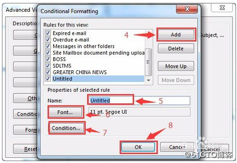 4、然后點(diǎn)擊“Add”,新增自定義組,然后給這個(gè)組命名,老板的郵件組可以命名為“BOSS”“BIG BOSS”,哈哈,隨你喜歡;然后點(diǎn)擊Font,設(shè)置自定義標(biāo)記的顏色、字體和字號(hào);最后點(diǎn)擊"Condition",設(shè)置自定義的條件。