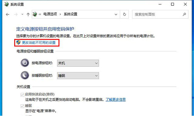 如果無法修改關(guān)機(jī)設(shè)置的操作,我們先點擊“更改當(dāng)前不可用設(shè)置”,如下圖所示