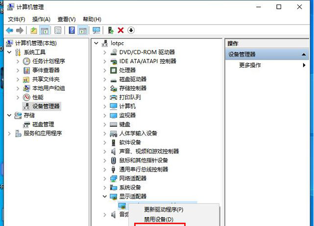 在計算機(jī)管理界面中,我們點擊“設(shè)備管理器”,展開“顯示適配器”,找到獨立顯卡設(shè)備,我們右鍵點擊選擇“卸載設(shè)備”,(如果您有獨立顯卡和集成顯卡,如果分不清哪個是獨立顯卡還是集成顯卡,可以將其都卸載,重新安裝。)如下圖所示。