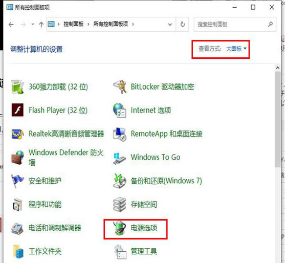 首先我們打開控制面板,將查看方式修改為“大圖標(biāo)”,點擊“電源選項”,如下圖所示。