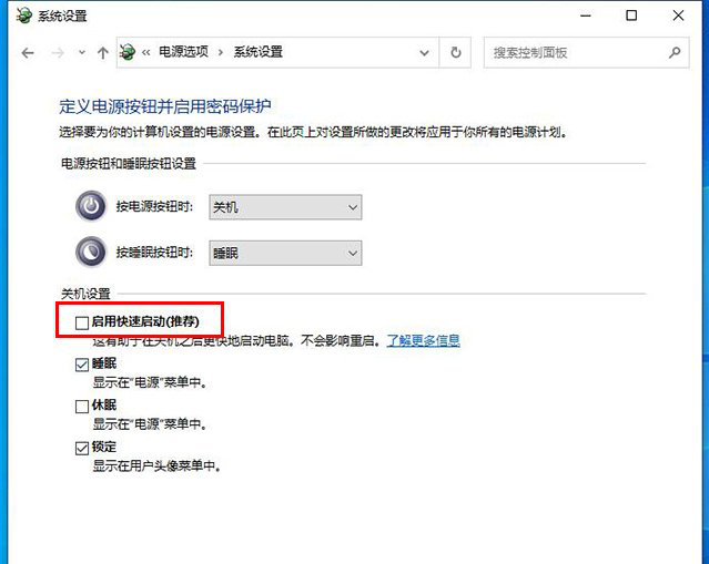 在關(guān)機(jī)設(shè)置中將“啟用快速啟動(推薦)”前面的勾選上即可,如果默認(rèn)勾選了“啟用快速啟動”,就不用管它了。