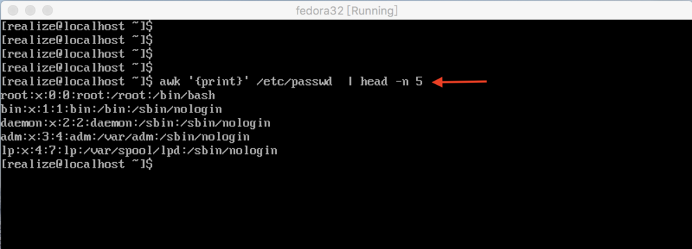 7、awk命令能夠指出顯示第幾行的數(shù)據(jù),下圖所示,awk顯示passwd文件中的第五行數(shù)據(jù)
