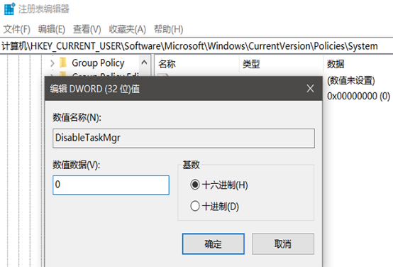 注:如果沒(méi)有找到該注冊(cè)表,則右鍵System點(diǎn)擊新建,選擇DWORD(32位)值(D),將名字改為DisableTaskMgr并設(shè)置數(shù)值為0即可。