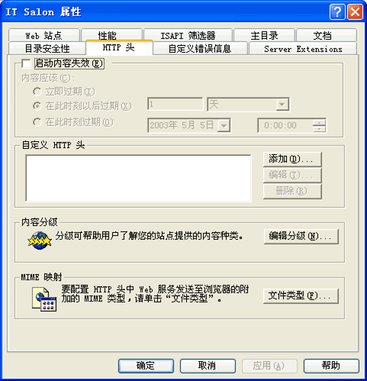 2.在IIS平臺創(chuàng)建一個新的MIME類型 先選擇WAP站點的屬性,再加入MIME類型,然后選擇HTTP Headers標簽。