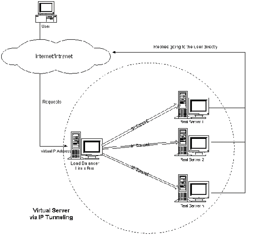 上圖來自Linux Virtual Server Project,為他們使用IP隧道實(shí)現(xiàn)的這種負(fù)載分擔(dān)能力的請求/回應(yīng)過程,此時(shí)每個(gè)后臺服務(wù)器都需要進(jìn)行特別的地址轉(zhuǎn)換,以欺騙瀏覽器客戶,認(rèn)為它的回應(yīng)為正確的回應(yīng)。