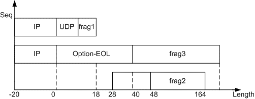 · 第三片offset為0,more frag為1,也就是還有分片,40字節(jié)的IP option,都是EOL,IP載荷為224字節(jié)。
