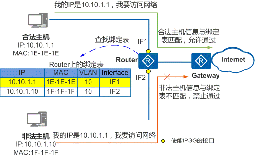 IPSG利用綁定表(源IP地址、源MAC地址、所屬VLAN、入接口的綁定關(guān)系)去匹配檢查二層接口上收到的IP報文,只有匹配綁定表的報文才允許通過,其他報文將被丟棄。