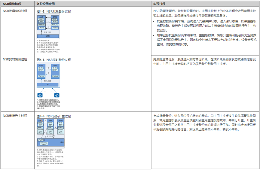· NSR:通過協(xié)議備份機制,實現(xiàn)主備倒換時控制平面(路由)和轉發(fā)平面(業(yè)務)均不中斷。