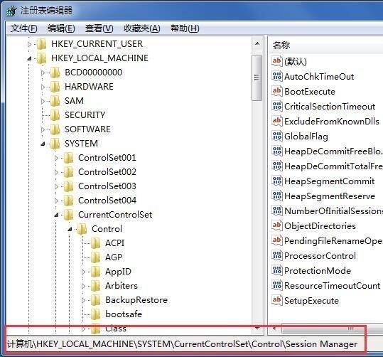 3、然后展開注冊表目錄“HKEY_LOCAL_MACHINE\SYSTEM\CurrentControlSet\Control\Session Manager”;