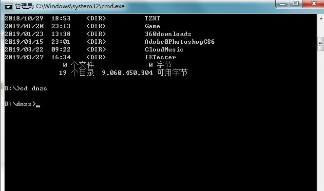 1、同以上方法一樣,打開cmd,輸入d:回車進(jìn)入D盤。在光標(biāo)處輸入 "cd dnzs",按Enter就可以進(jìn)入目標(biāo)文件夾。