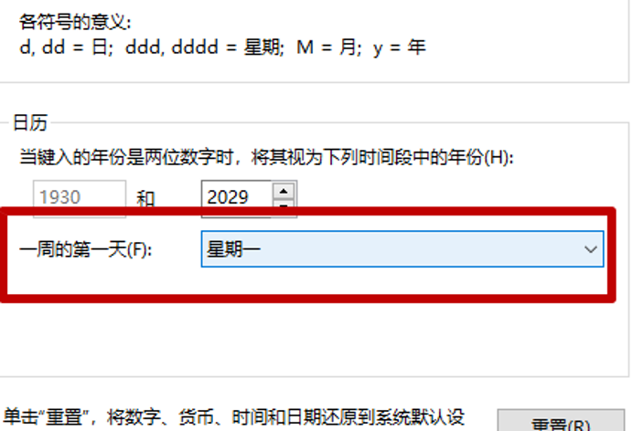 5、最后在該頁面中在一周的第一天右側(cè)設(shè)置選擇“星期一”選項即可。