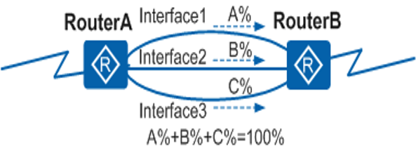 · 當(dāng)主接口Interface1的數(shù)據(jù)流量超過(guò)負(fù)載分擔(dān)門限的上限閾值時(shí),優(yōu)先級(jí)最高的可用備份接口將被啟用,同主接口Interface1一起傳輸業(yè)務(wù),進(jìn)行負(fù)載分擔(dān)。