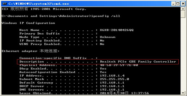 開始——運行——輸入cmd,回車——在命令窗口輸入“ipconfig /all”回車,然后本地連接的description一欄就是網(wǎng)卡型號。 另外可以在其他電腦上下載一個魯大師,安裝后默認界面就會顯示網(wǎng)卡和主板型號。