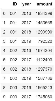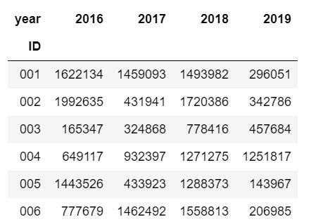 data1 = data.pivot(index = "ID",columns="year",values="amount" )data1 #為了不改變?cè)瓟?shù)據(jù),將數(shù)據(jù)透視后的結(jié)果賦值給data1