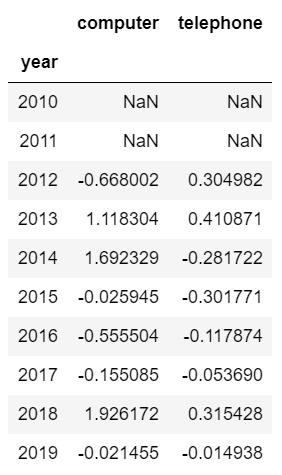 這里需要注意的是,我們希望能夠保留年份信息,而用來(lái)計(jì)算的函數(shù)會(huì)把表格中所有數(shù)值型數(shù)據(jù)都進(jìn)行環(huán)比運(yùn)算,所以需要提前將年份信息轉(zhuǎn)化成索引: