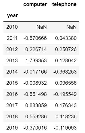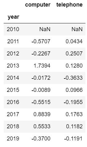 這里的行索引和列名可以進(jìn)行互換,在data.pivot()的參數(shù)中進(jìn)行設(shè)置就可以,雖然和第一種情況類似,但是仔細(xì)觀察又發(fā)現(xiàn)了不同,第一種情況數(shù)據(jù)集的行索引是年份,這份數(shù)據(jù)中行索引是產(chǎn)品ID,其實(shí)這個(gè)是沒(méi)有影響的,計(jì)算環(huán)比增長(zhǎng)率的方法中有參數(shù)可以解決這種情況:
