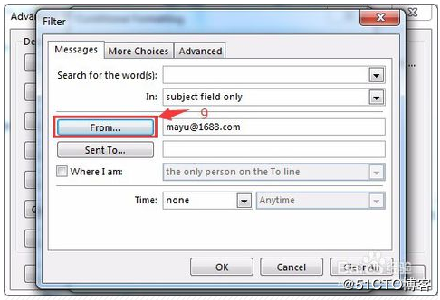 5、在彈出的對(duì)話框中,點(diǎn)擊“From”選擇要標(biāo)記的郵件地址,或直接填入右邊的對(duì)話框中,然后點(diǎn)擊OK,一路OK到底就好了。