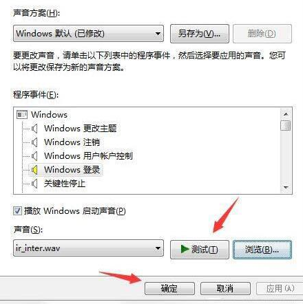 5、我們可以測試一下這個聲音文件是否正常,試聽之后如果滿意,可以點擊確定關(guān)閉此設(shè)置頁,下次開機時系統(tǒng)發(fā)生的聲音就是你設(shè)置的聲音;如圖所示:(北京艾銻無限)