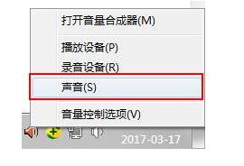 1、首先點擊系統(tǒng)托盤區(qū)的小喇叭的圖標(biāo),右鍵點擊,然后點擊聲音這個選項;如圖所示: