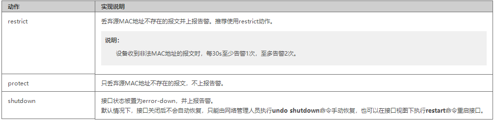 接口上安全MAC地址數(shù)達(dá)到限制后,如果收到源MAC地址不存在的報(bào)文,端口安全則認(rèn)為有非法用戶攻擊,就會(huì)根據(jù)配置的動(dòng)作對(duì)接口做保護(hù)處理。缺省情況下,保護(hù)動(dòng)作是丟棄該報(bào)文并上報(bào)告警。
