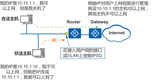 一個典型的利用IPSG防攻擊的示例如圖1所示,非法主機(jī)偽造合法主機(jī)的IP地址獲取上網(wǎng)權(quán)限。此時,通過在設(shè)備的接入用戶側(cè)的接口或VLAN上部署IPSG功能,設(shè)備可以對進(jìn)入接口的IP報文進(jìn)行檢查,丟棄非法主機(jī)的報文,從而阻止此類攻擊。